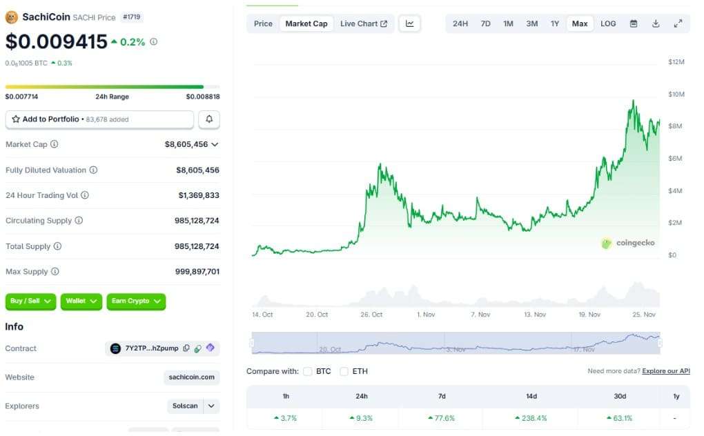 就估值而言,SACHI 目前的市值约为860 万美元(数据来源:Coingecko),在撰写本文时,其市值处于新兴模因代币的中等水平。