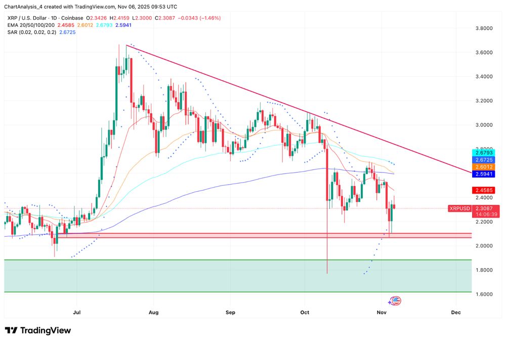 日线图显示,XRP 被困在一条从年内高点延伸而来的清晰下降趋势线下方。每一次试图突破该趋势线的尝试都立即遭到拒绝,包括最近一次在 2.45 美元的尝试。