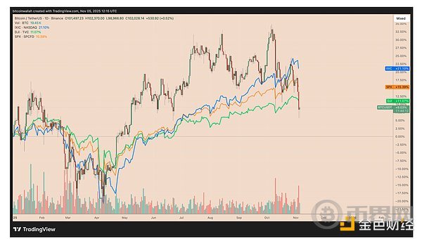 BTC/USD 与纳斯达克、道琼斯和标普 500 指数年初至今走势图