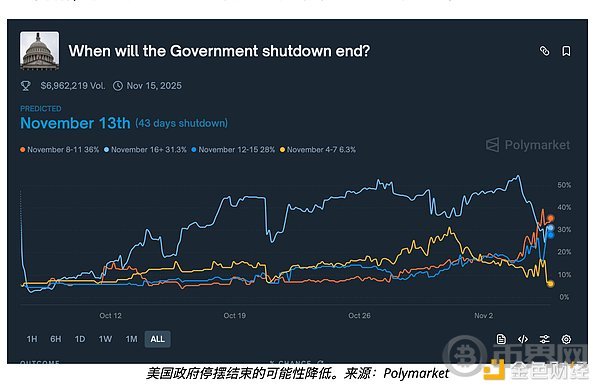 对多头而言幸运的是,停摆问题可能很快就能得到解决。在 Polymarket 平台上,越来越多的交易者押注停摆最早将于下周结束。