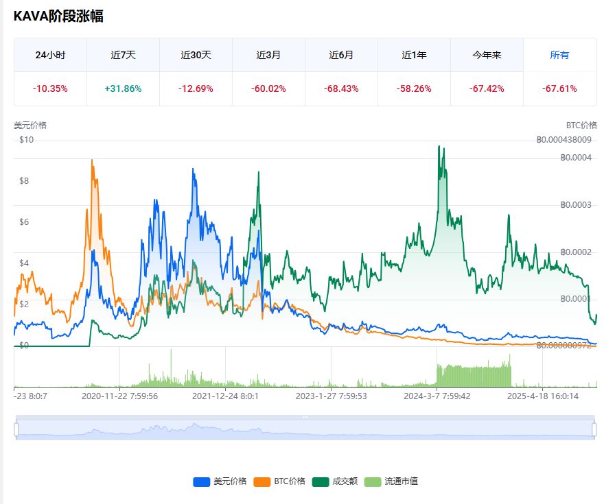 截至11月10日(当地时间)下午2:38,BTCC交易所市场数据显示,KAVA代币24小时上涨6.8%,交易价格为0.174美元。在过去的24小时内,KAVA代币最低曾跌至0.156美元,最高曾涨至0.194美元。目前,KAVA在CoinMarketCap上的排名为第186位,总市值为187,842,875美元。