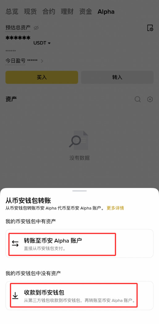 2. 如果您的币安钱包中已有资金,可直接选择【转账至币安 Alpha 账户】。