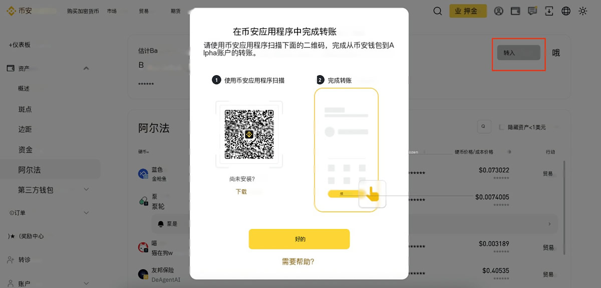 1. 打开币安App(官方注册 官方下载),前往【资产】-【币安 Alpha】,然后选择【转入】。