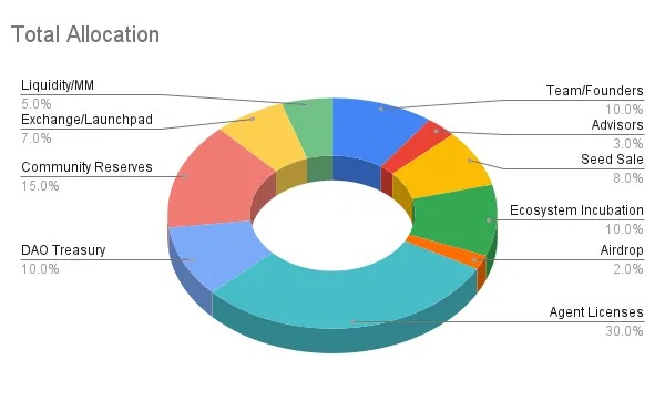 最大供应量为 100 亿。分配比例:团队/创始人 10%,顾问 3%,种子轮 8%,生态系统孵化 10%,空投 2%,代理许可 30%,DAO 资金池 10%,社区储备 15%,中心化交易所/启动平台 7%,流动性及市场管理 5%,包含悬崖式和线性归属。