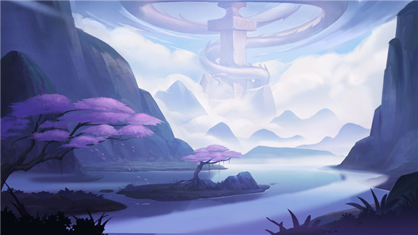 远处云雾朦胧,寥寥几笔勾勒出若隐若现的神龙盘踞景象。镜头拉近,便可看到湖泊树干,紫色树木的给画面增添一份神秘感。用色彩描绘意象,在写意和写实之间达到一个微妙的平衡,仿佛已经看到了风起云涌的破天江湖。
