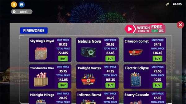 根据节庆需求选择不同的烟花进货,春节主推红包礼炮,中秋上架月圆花束;每次精准进货都能提升店铺人气值,人气累积即可扩建仓库、解锁高端烟花,实现规模与等级的双重飞跃。