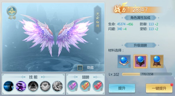 上仙们可以使用翅膀精华来升级翅膀,提高自身的生存能力,翅膀等级达到91,191,291,341级时还能解锁强力的辅组技能,帮助上仙们更轻松地战胜对手。