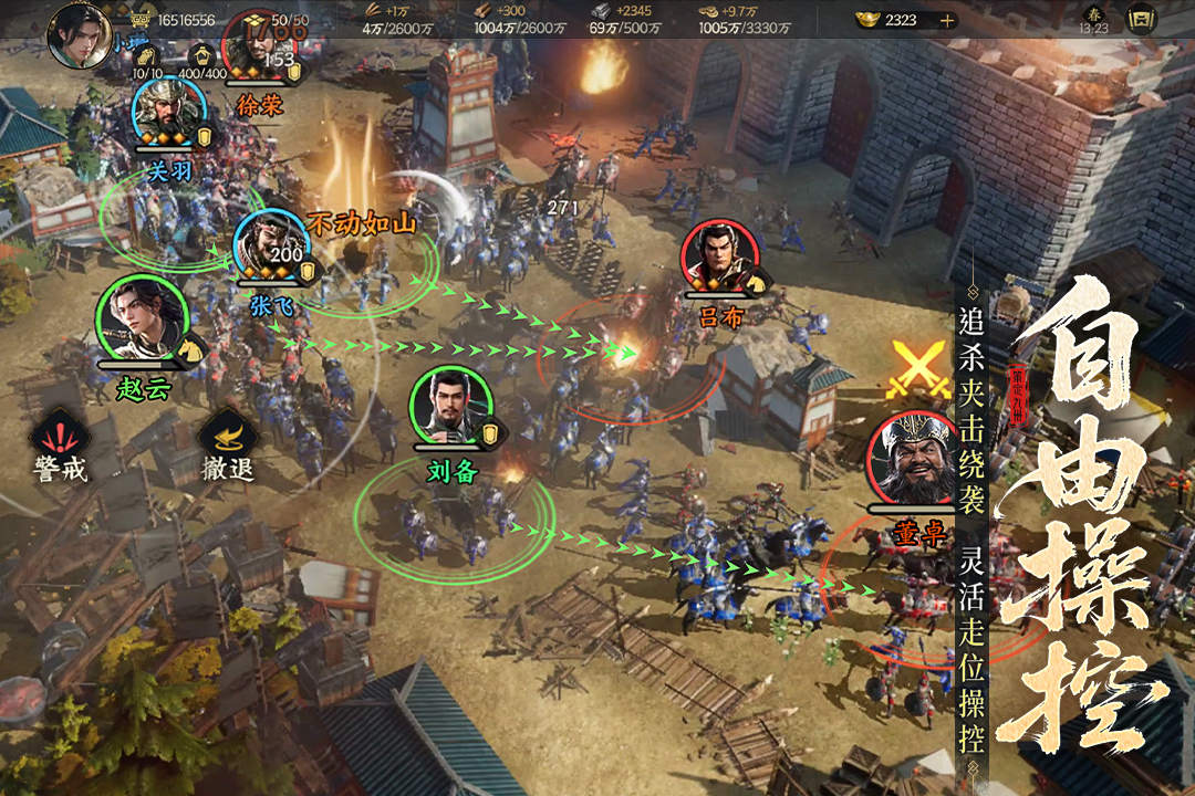 游戏中的山川河流不再仅仅起到阻隔行军的作用,玩家还可以利用地形进行作战。玩家在击退城门守军并拆除城皮后,可进军至城池内部进攻主殿,可在各道路拦截从多方赶来的援军,阻止其增援主殿。