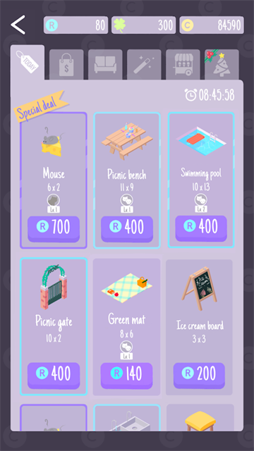 配备野餐垫、沙滩床、游泳池、BBQ烤架等上百种家具和装饰,可按喜好自由搭配。