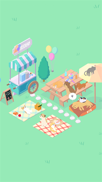 公园中有许多猫狗,制作冰淇淋吸引它们。如果动物喜欢你的冰淇淋,可能会加入野餐。
