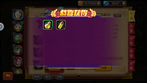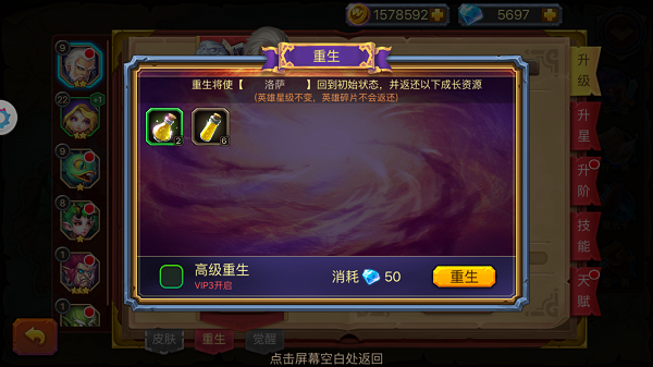 点开一个英雄,在界面下方找到“重生”入口,进入之后可看到重生返还的资源种类和数量。初级重生返还的资源是有损失的,如果玩家想要返还全部资源得在重生界面下方勾上高级重生,花费一定数量钻石则可返还所有资源。