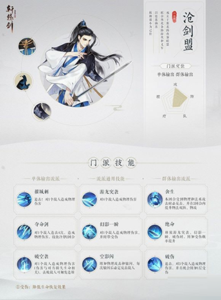 随风飘逸的墨色长发,神采奕奕的剑眉星目,执剑而立,尽显侠客风范。配音演员李靖以其独特的嗓音进行诠释,更为立体地塑造出了倜傥不羁的江湖游侠形象。沧剑盟凭借高超剑技威震江湖,在攻击与防御两个属性上,都有着较大优势。门派技能主要分为单体输出与群体输出两个流派,准确判断作战形势,激活相应流派,方能技惊四座,所向披靡。