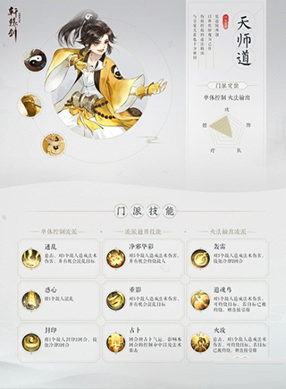 亮黄主色飘逸于衣袍之上,方寸之间尽显灵动;道教元素点缀其间,通灵圣手模样跃然纸上。在配音演员小连杀的演绎下,小道童活泼开朗的形象更是展露无余。天师道以斩妖除魔为己任,深谙控敌伤敌之道法,长于控制、火法输出。门派技能主要分为单体控制与火法输出两个流派,目前共有9大技能供玩家选择与搭配。