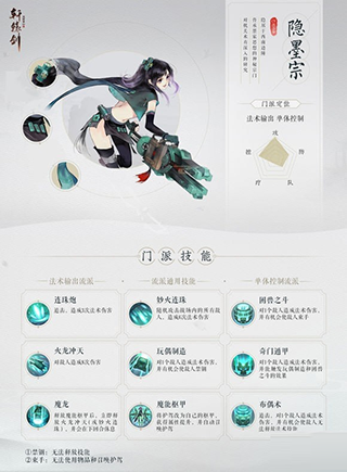 隐墨宗角色形象娇小玲珑,手中却举着十分抢眼的机关武器,此等反差为玩家们留下了深刻印象。细细考究,象征巴山蜀水的墨绿色调、写有“非攻”字样的腰牌装饰、披风上的太阳神鸟纹饰等,都将门派渊源与地域文化融入了角色造型的设计之中。配音演员沈念如一腔灵动的声线,更是为其再添了几分活泼与灵气。隐墨宗长于机关术的研究,因此门派技能上也处处体现着“巧手幻形制机关”的高超技艺,在攻击和控制上都有不俗表现。门派技能主要分为法术输出与单体控制两个流派,门派独有的机关术使其技能效果别具一格。
