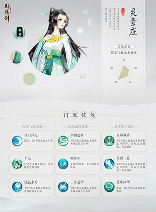 冰肌玉肤,眉心花钿轻点;碧色绸缎,勾勒窈窕身姿。灵素庄遗世而独立的佳人形象,令人见之忘俗;济世救民的慈悲之心,更是为人称道。配音演员新月冰冰的优美声线,将其儒雅医者的风范演绎得淋漓尽致。灵素庄门派尽得药王真传,门下弟子皆为通晓医术之才,以济世救民为己任,亦可法术输出。门派技能主要分为恢复气血与法术输出两个流派,玩家可根据需要自由选择。