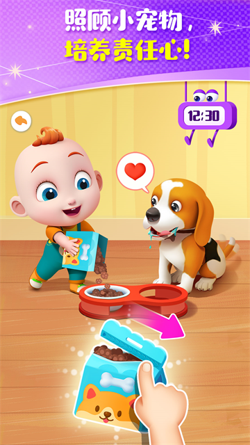 4、通过与JoJo玩耍,宝宝可以学会各种生活常识、生活技能,如与JoJo一起喂养小狗Bingo。
