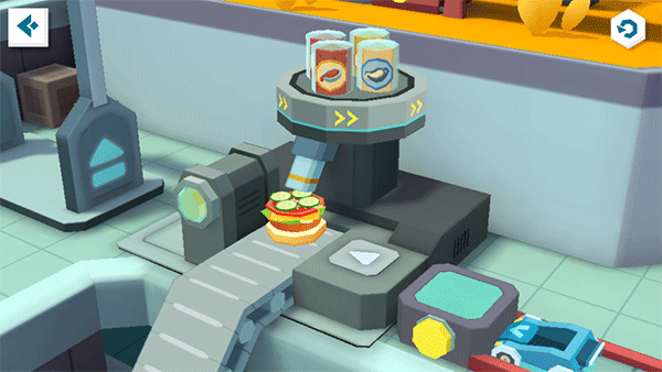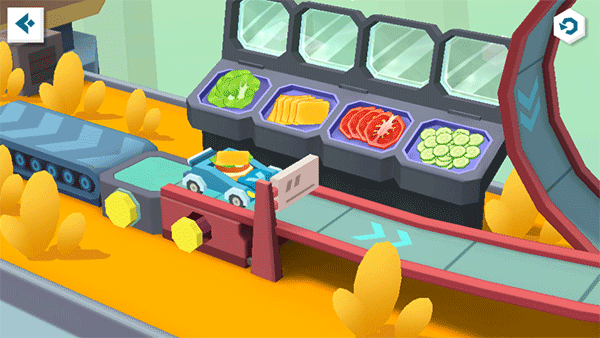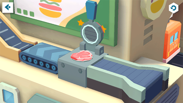 3、通过弹球桌翻滚汉堡,最后盖上面包完成制作。