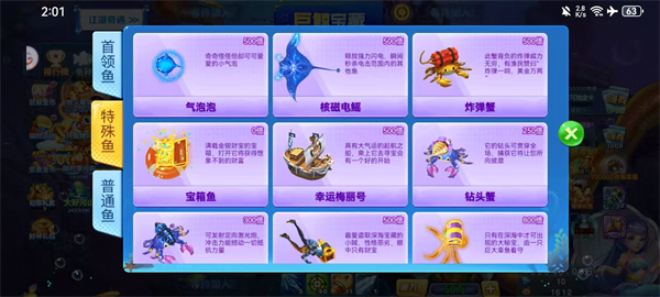 渔场与奖励机制:游戏设有五大渔场场景,每个场景都有丰富多变的鱼种,为玩家带来不同的挑战和乐趣。BOSS最高可提供千倍奖励,而炮台倍率无上限,让玩家的收益潜力无限。