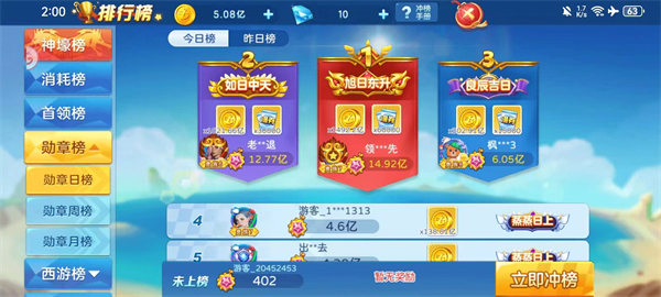 2、在任意渔场内打鱼获得金币就会统计勋章;进入榜单就可获得奖,排名越靠前奖励越丰厚。