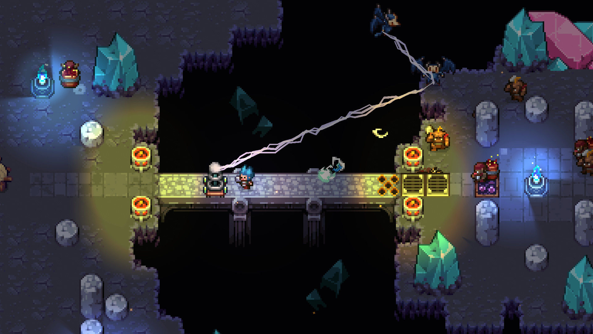 刚开始看着像素还以为是个开放自由模式,结果玩完体验期一直是个剧情发展模式,就是跟着剧情走,以前去过的地图,再去就去不了了,而且地图里你走到特定位置,怪物出现,打完怪以后地图就什么也没有了,也不用想什么锄大地之类的。目前出现可以互动的就是陶罐,杂草,稻草,摧毁可以有几率给齿轮(看着像),也不知道什么用(根据最后剧情,有可能是给炮塔升级)。