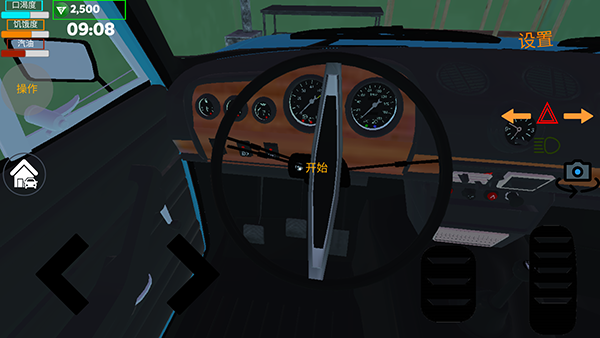 4、进入汽车之后,将准星对准汽车方向盘后面的钥匙孔,长按左上角操作启动汽车(注意一定要长按,直到汽车仪表盘动了为止),此时汽车已经启动完毕,通过右下角刹车油门控制汽车移动。