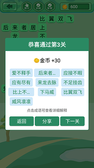 每组成语化为通关利剑——积累的词汇量越多,解锁的关卡越难,从入门到精通层层进阶,最终登顶成语宗师宝座