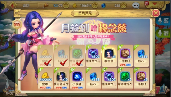 签到可以说是每天登陆游戏后第一件要做的事情。在每个自然月内,玩家每天都可签到一次获得不同的游戏道具奖励。累计签满一个月好能获得英雄奖励哦!