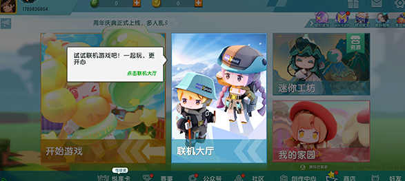 1、进入到游戏大厅之后,有四种游戏模式可以选择,分别自建房间、联机玩法、迷你工坊、我的家园;