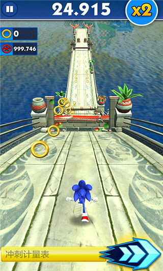 通过学习游戏的新手教程,你会知道当我们向下划动屏幕时,索尼克就会用经典的翻滚动作打击敌人,这个操作同样可以用来钻过桥洞等障碍。但很多玩家没意识到,向下滑动带来的短暂加速效果极为有用,尤其当你获得“吸铁石”道具时,多使用滚动技能会吃到很多的“金环”。另外,假如前方有紧连着的多个“桥洞”需要钻过,你也只需向下划动一次就行,索尼克的滚动时间会被显著加长。