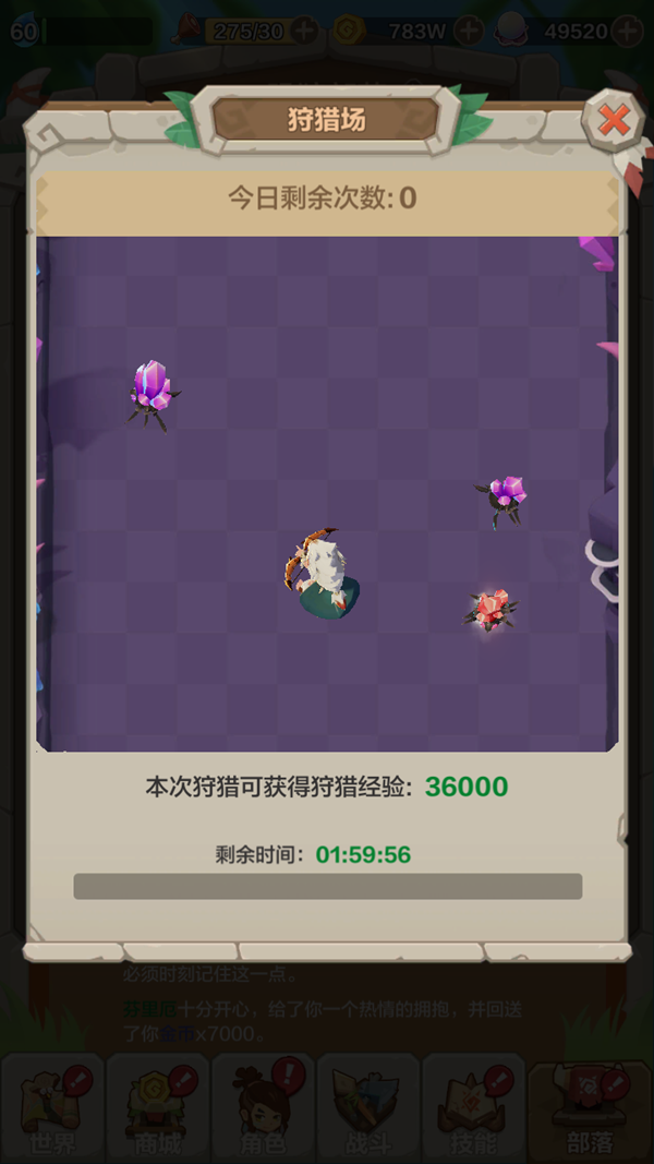 在狩猎场可获得大量狩猎经验,提升狩猎等级,不要忘记每日狩猎哦~