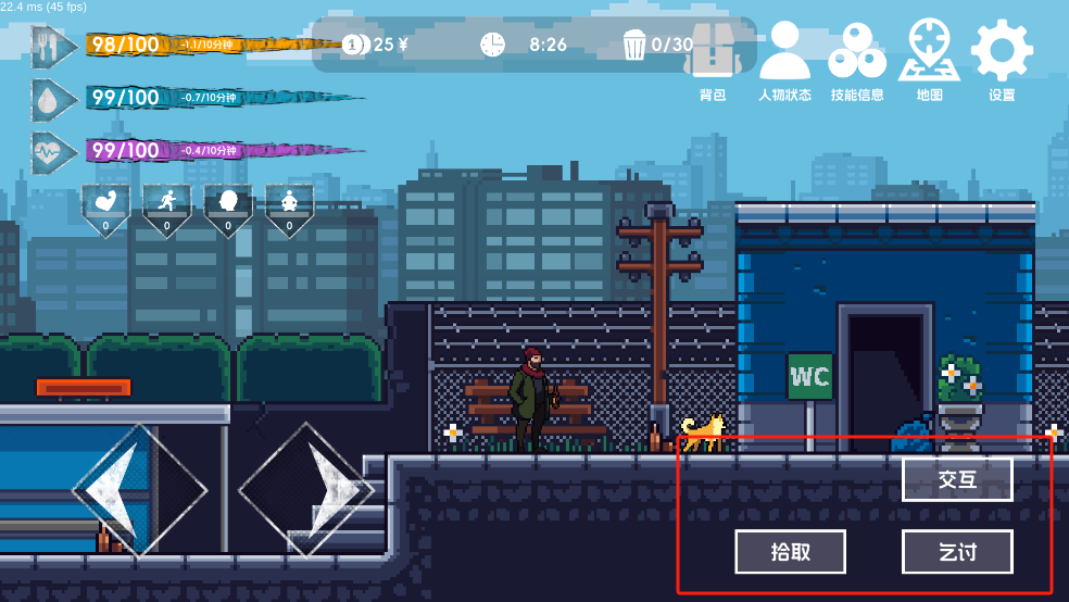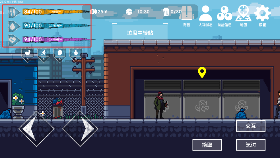 7、在进入夜晚后(21点)会消耗大量属性,如果是在户外则很有可能会在黑夜中倒下,所以请选择在收容所或者宾馆吧。