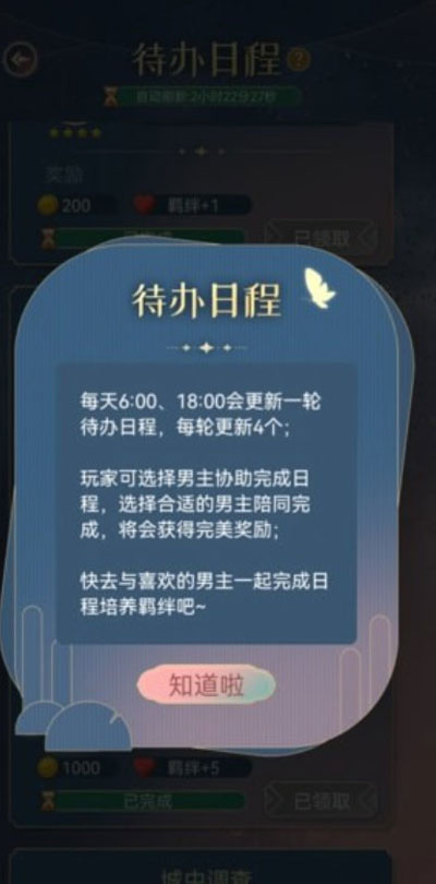 游戏中每天的6:00、18:00都会更新一次待办日程,每次可以更新四个任务,玩家需要选择与事件相对应的男主协助完成任务,在选择对的任务就可以获得大量的好感度,但是选错了虽然会获得奖励,但是奖励就比较少。