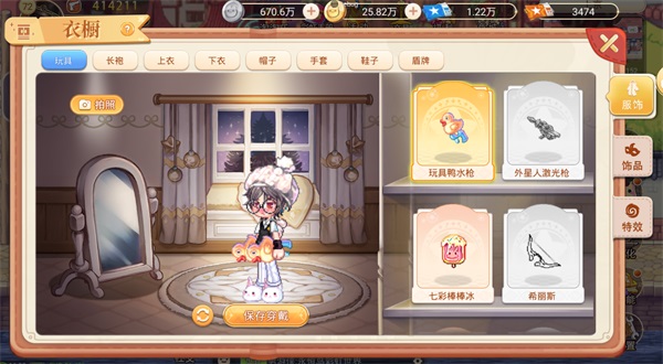 衣橱中可以查看当前已获得时装部位,包括服饰、饰品、特效3部分。