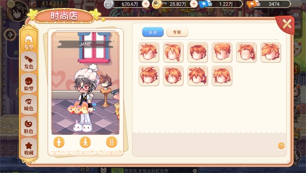 时尚店可以对游戏形象的发型、发色、脸型、瞳色、肤色做调整。
