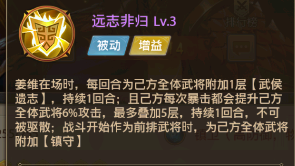 相信姜维这个武将大多数人都还是不太了解吧。大部分肉都是有一个镇守的效果,都可以适用反套装的,姜维的也是一样,但是姜维三技能是带有吸血效果的,不仅仅肉还能回血伤害还高是什么概念,简直打不死啊,带上反伤套装还给敌方再次带来伤害,可以说姜维是个半肉办输出,而且已方每次暴击都可以给已方阵容增加6%的伤害,如果带上神关那就是一刀一个小朋友了。