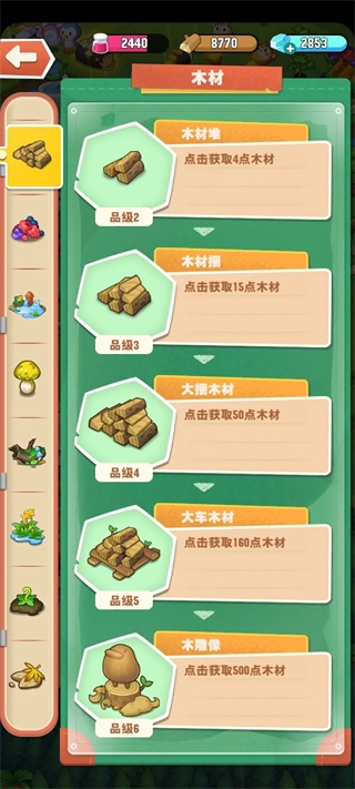 木头来源也多,要有梧桐树,十三级梧桐树就能拿到四级木头,参加了荷花季的伙伴们还可以通过用硕大莲藕做菜给布丁吃,获得一些木头和环保袋,还有过关以及任务,商店都有。