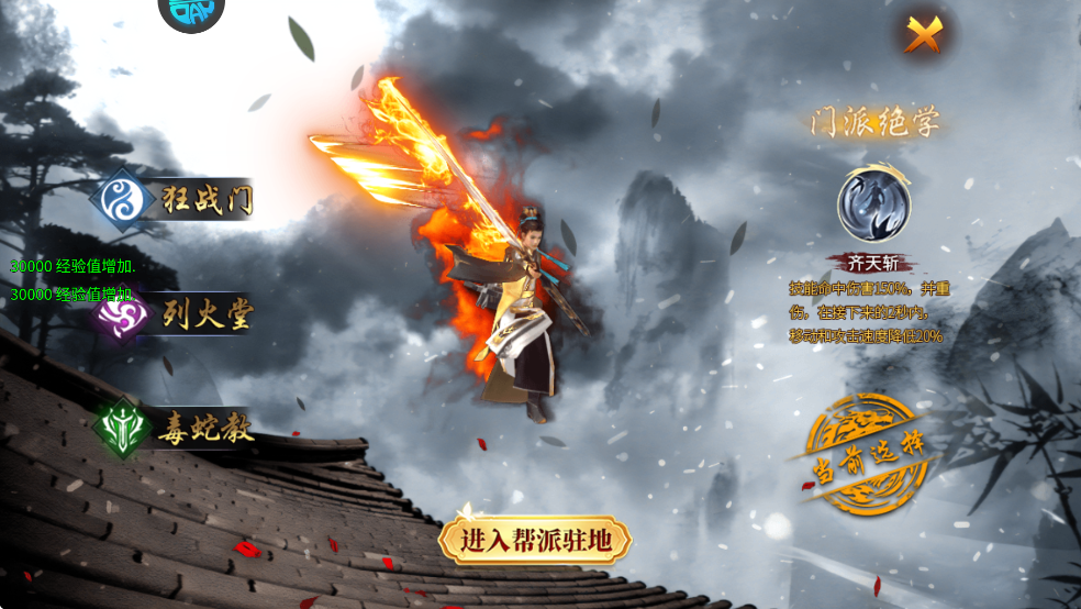 门派绝学:【齐天斩】技能命中伤害150%,并重伤,在接下来的2秒内,移动和攻击速度降低20%