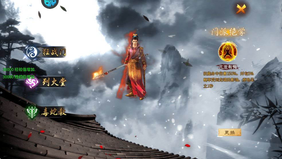 门派绝学:【亢龙有悔】技能命中伤害150%,并有5%概率受到龙啸的影响,原地呆立1秒