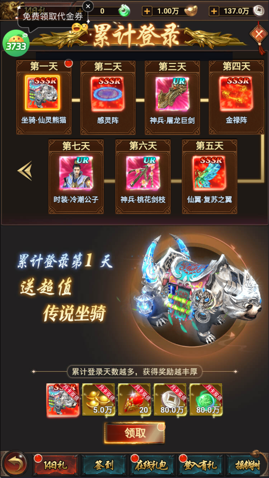 4、登录奖励:连续七日登陆即送绝版神话时装,炫酷外观助力冒险之旅