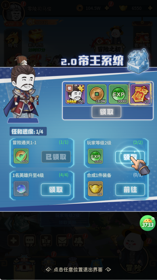 完成简单任务(通关、升级),领取武将碎片、经验、招募券等资源,快速推进进度。