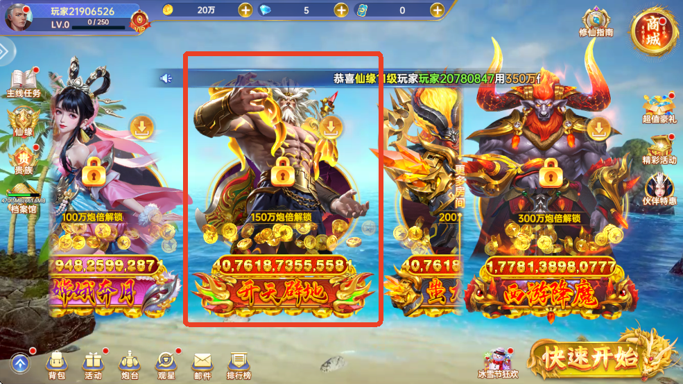 在捕鱼新纪元微信版中,混元破裂!勇士们可以通过将炮倍提升至150万,解锁崭新的挑战场次,感受天地分开,造化万物的浩瀚。