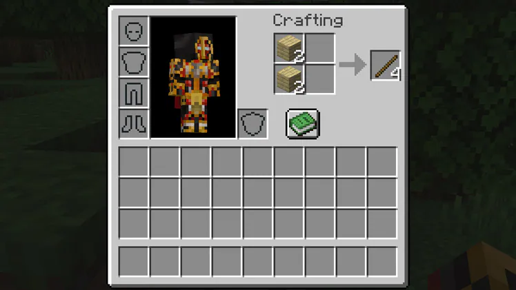 打开您的物品栏。在这里,您可以看到自己携带的所有物品,包括穿着的盔甲、配方书以及合成终端。合成终端由四个空的方形槽位组成,其中有一个箭头指向“合成”下的第五个空的方形槽位。