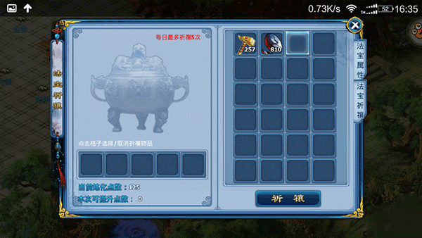 冰冻三尺非一日之寒,所以法宝牛掰也非获得就牛掰了,和天命系统一样,需要升级,才可以实现实力的飙升,这就需要每日祷告,每日祷告五次,获得提升点,现阶段除了系统开始送的石头可以吃掉获得1W提升值以外,就靠消耗玄铁和锤子,来获得点数。