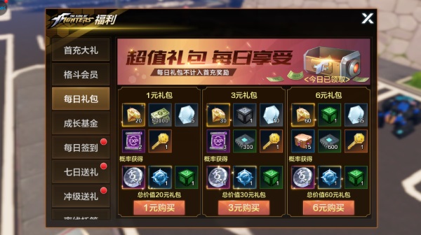 二、点击主界面中的“福利”按钮,即可购买1元礼包、3元礼包、6元礼包,及格斗会员等。