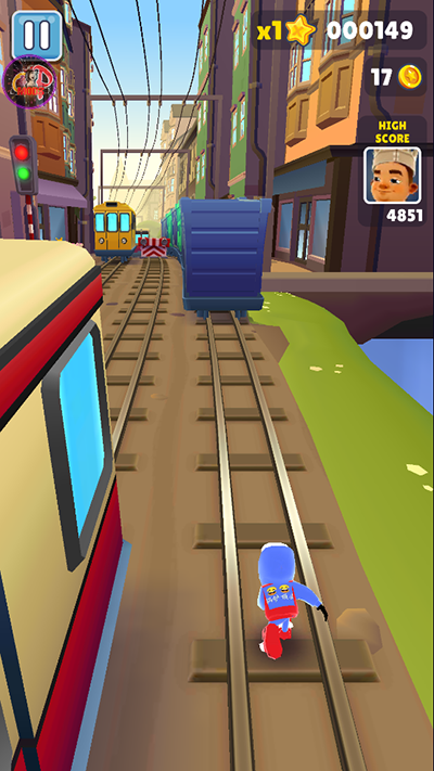 玩家经常遇到的一种情况。左右两路没有任何障碍,中路有5~6辆火车奔过来。为了能够把车上的金币吸收干净,这个时候就可以运用基础组合跳滚了,前提是不要玩得太很,稳一些较好,如果火车还没到达玩家下方,玩家就已经在半空中往下划那么就只有死翘翘了。