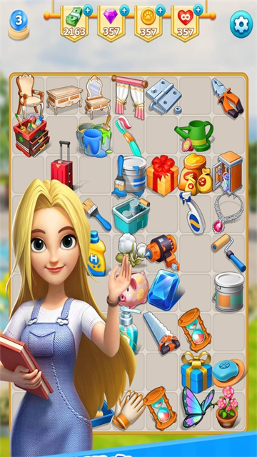 2、当金钱不足时,点击右下角进入消除小游戏。在这里拖动两个相同的工具将它们合并在一起,灰色的是无法直接拖动,只能被动合并,完成上方的工具任务时就可以获得金钱去进行装修。