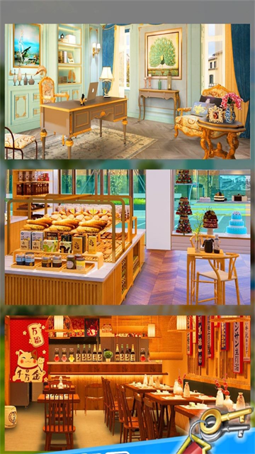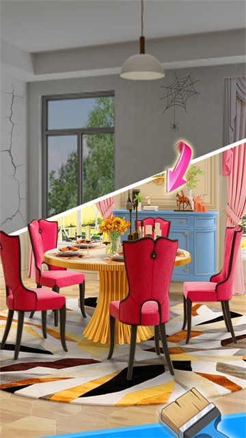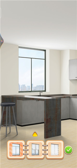 1、游戏开始,当选择一处地方需要装修时,使用一定的金钱后会出现三个不同风格的家居,根据自己的喜好来进行搭配。