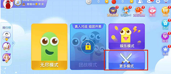 1、我们点击贪吃蛇大作战的主页面中,选择更多模式,在这里面就能看到刀剑大作战,继续点击即可进入刀剑模式。
