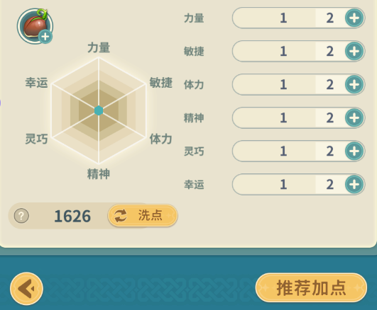 分为力量、敏捷、体力、精神、灵巧、幸运,每种属性对应不同的作用,可以根据伙伴特点进行点数分配