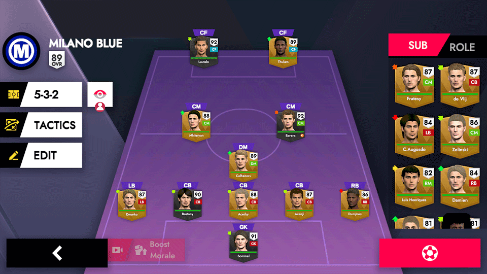 4、点击右下角的足球图标后,进入阵容调整界面。拖动右侧球员到指定位置,合理排兵布阵,确定战术阵型。
